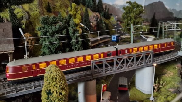 Vorbild: Schnelltriebwagen Baureihe SVT 04 der Deutschen Bundesbahn (DB). Reichsbahn-Bauart SVT 137 „Hamburg“. Zweiteilig mit Jacobs-Drehgestell. Ausführung als FT 231 „Montan Express“ von 1954.