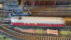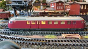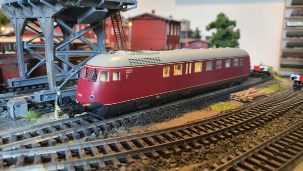 Vierachsiger Dieseltriebwagen Baureihe VT 92.5 der Deutschen Bundesbahn (DB). Mit Pufferverkleidungen. Beheimatet in Nürnberg. Als Versuchs-VT unter anderem im Eilzugdienst im Einsatz auf den Strecken Nürnberg-Amberg und Nürnberg-Furth im Wald. Purpurrote Grundfarbgebung. Triebwagen-Betriebsnummer VT 92 501. Betriebszustand um 1957 bis 1959.