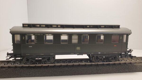 2. Klasse. Früherer C4i Pr15, 3. Bauserie. Ausführung mit zwei geschlossenen Übergängen. Dach und Oberlicht in Umbauausführung. Typspezifische Drehgestelle. Griffstangen, Übergangsbleche und Batteriekasten angesetzt.