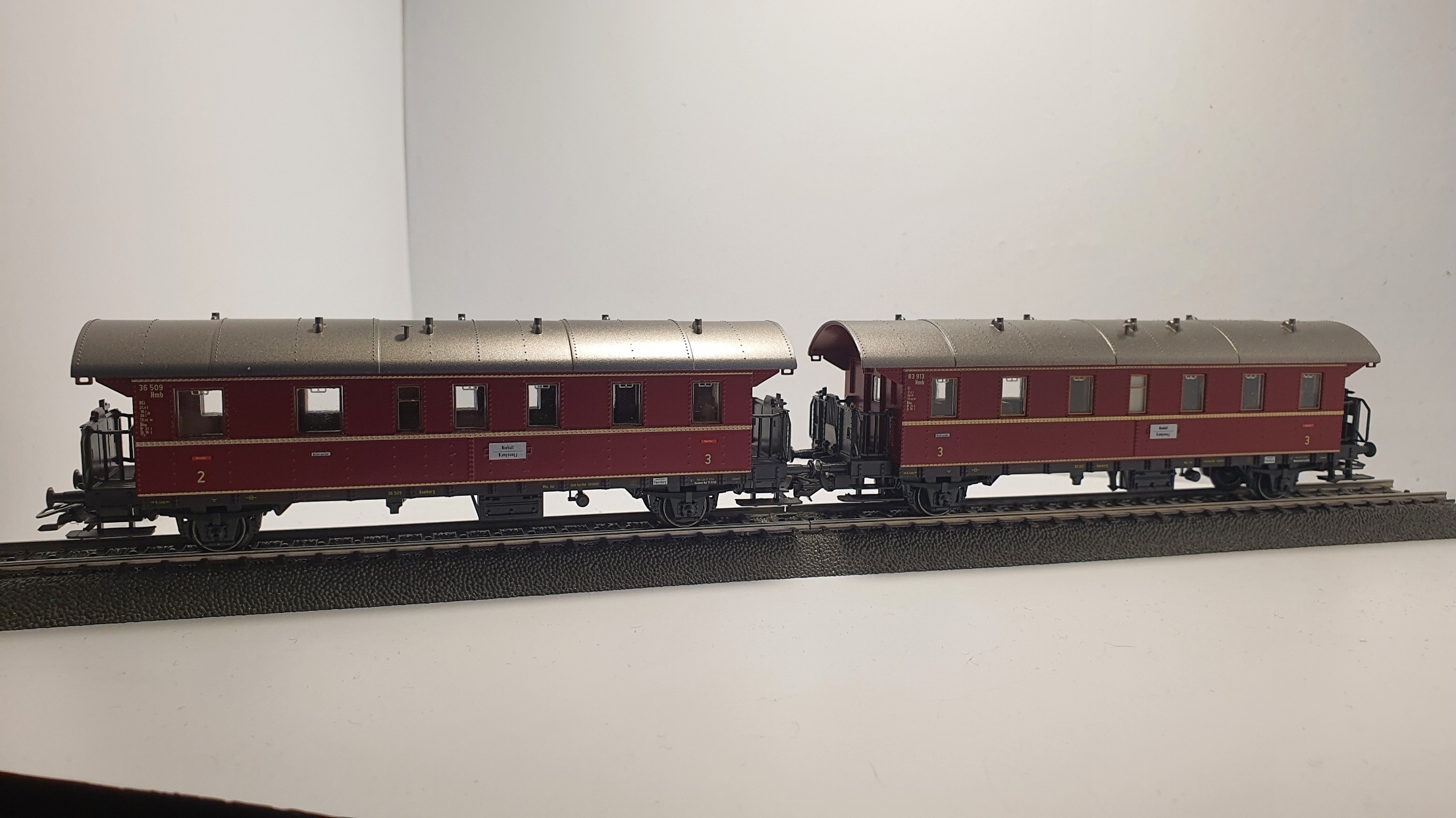 2 Personenwagen. 1 Wagen 2. und 3.Klasse mit Wagennr. 36 509. 1 Wagen 3.Klasse mit Wagennr. 83 913. Kunststoff-Gehäuse mit Schornstein.