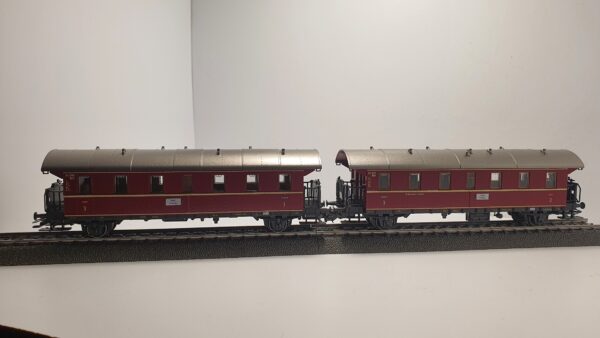 2 Personenwagen. 3.Klasse mit Wagennr. 84 099 Hmb. 1 Wagen 3.Klasse mit Wagennr. 83 323 Hmb mit Traglastenabteil. Kunststoff-Gehäuse mit Schornstein.