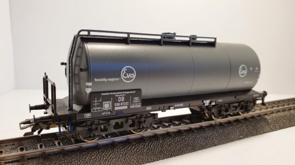 Einheits-Kesselwagen, eingestellt bei der Deutschen Bundesbahn (DB). Ältere Bauart mit Pressblech-Drehgestellen und Bremserbühne. Privatwagen der EVA, Eisenbahn-Verkehrsmittel-Aktiengesellschaft, Düsseldorf. Betriebszustand Anfang der 1960er Jahre.