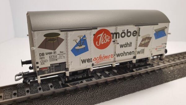 Zweiachsiger gedeckter Güterwagen mit Tonnendach und glatten Stirn- und Seitenwänden. Ehemaliger Milchwagen bayerischer Bauart. Privatwagen der Firma Ilse-Möbelwerke GmbH, Uslar, eingestellt bei der Deutschen Bundesbahn (DB). Betriebszustand um 1958.
