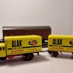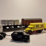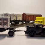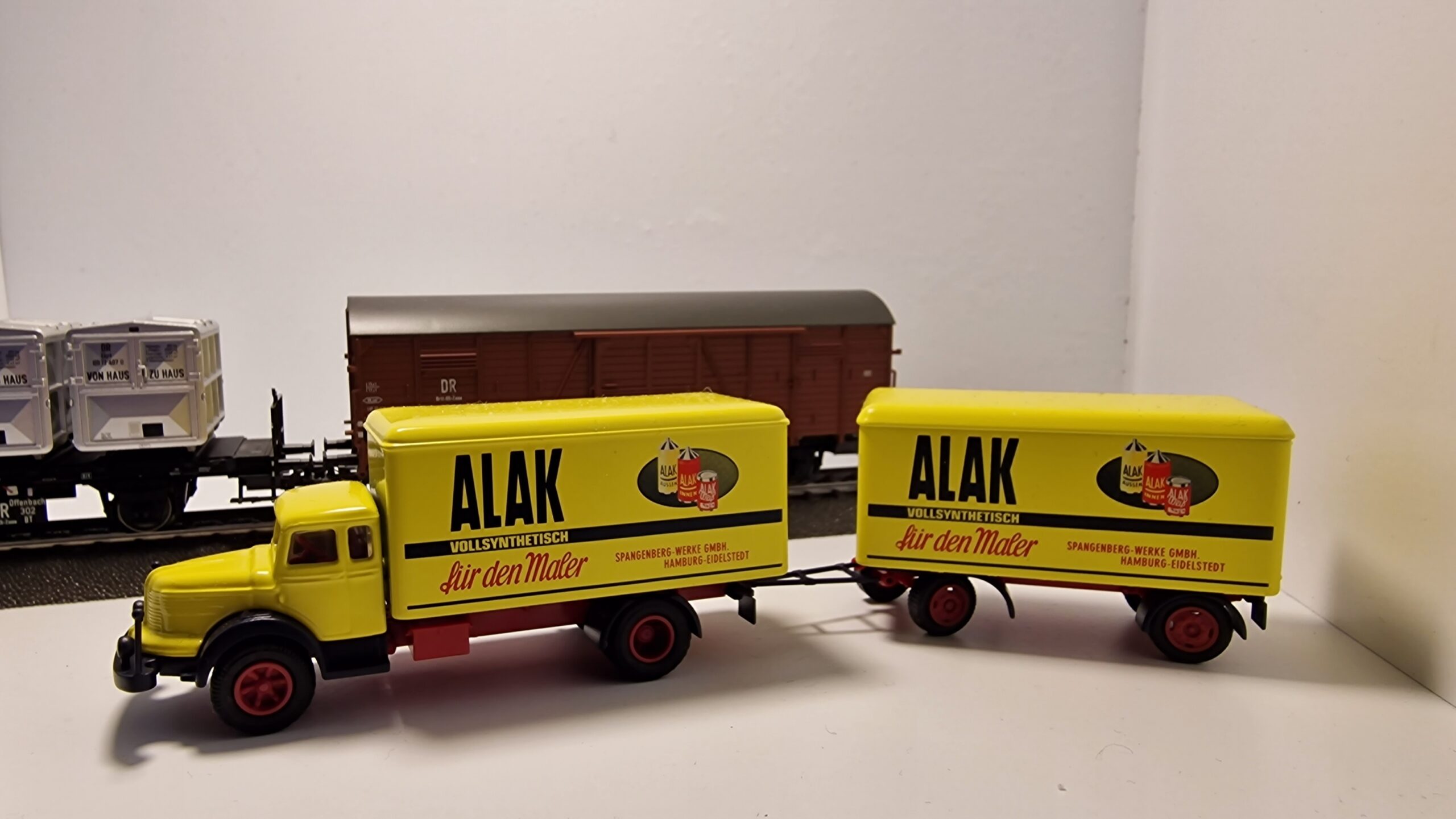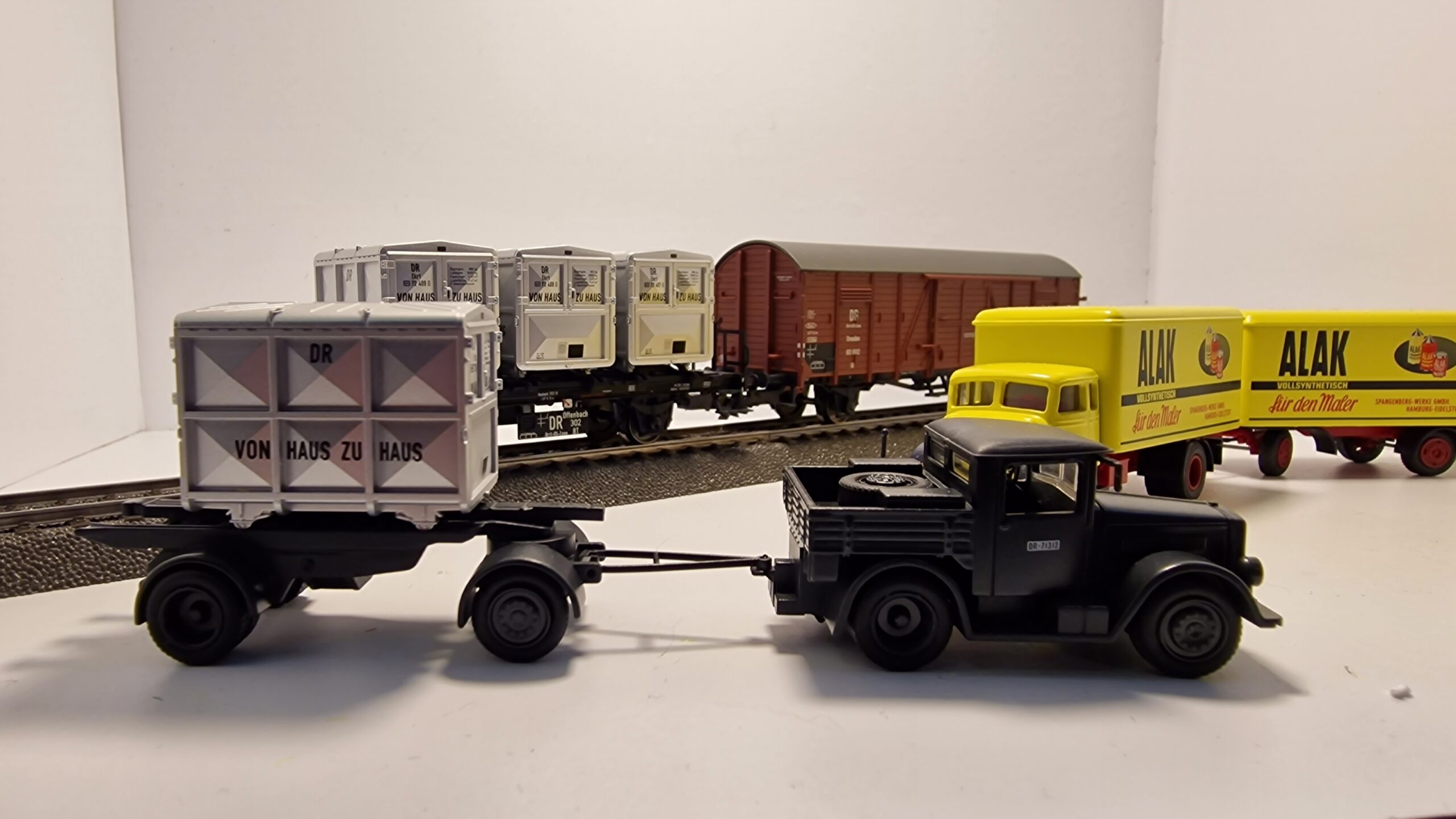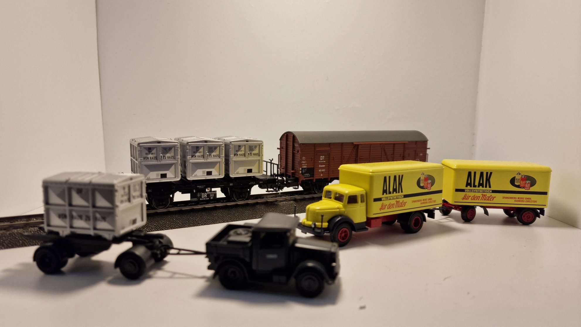 Set besteht aus: 1 gedeckter Güterwagen Gl Dresden der Deutschen Bundesbahn (DB), mit Kennzeichnung DR/Brit-US-Zone, 1 Behältertragwagen BTh Offenbach mit Bremserbühne der Deutschen Bundesbahn (DB), mit Kennzeichnung DR/Brit-US-Zone. Beladen mit 3 pa-Behälter Bauart Ekrt, in rechteckiger Form der Deutschen Bundesbahn (DB), mit Kennzeichnung DR/Brit-US-Zone. 1 Kälble-Zugmaschine mit 2-Achs-Anhänger der Deutschen Bundesbahn (DB), beladen mit einem zusätzlichen pa-Behälter, Bauart Ekrt. 1 Lastkraftwagen Krupp Mustang mit 2-Achs-Anhänger in der Gestaltung der Firma Spangenberg-Werke GmbH, Hamburg. Betriebszustand Anfang 1950er-Jahre.