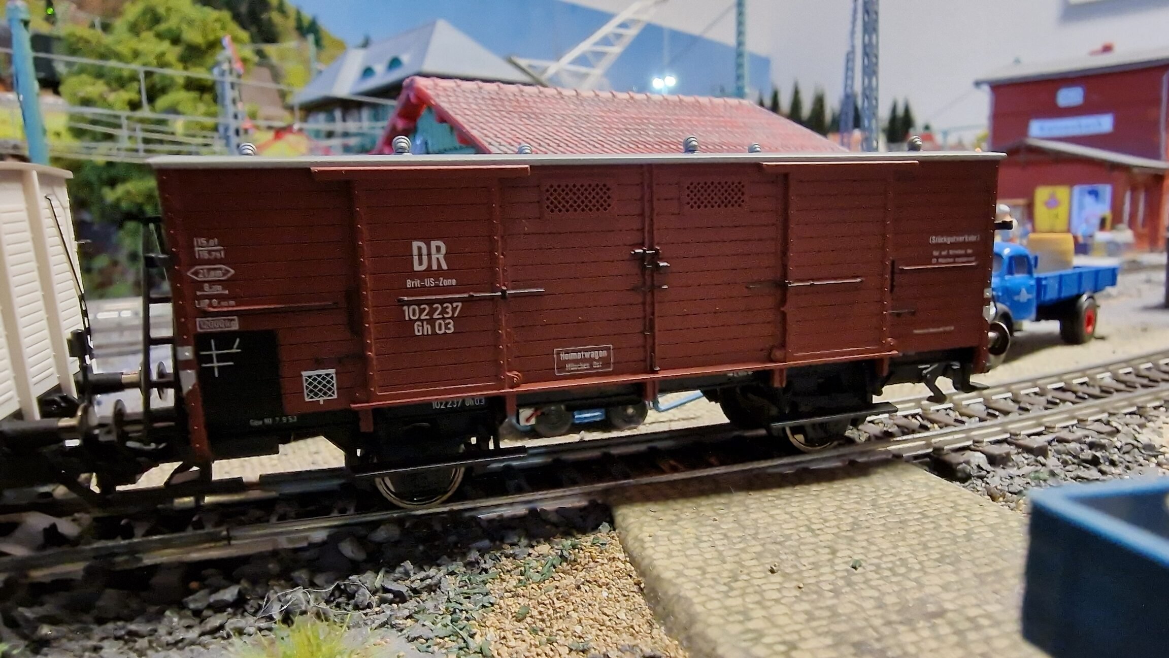 Wagen aus der ersten Lieferung 1908 mit Flachdach. Beide Wagen noch mit DR-Beschriftung der Britischen-US-Zone. Einsatz im Stückgutverkehr bzw. zum Transport von frischer Milch. Betriebszustand um 1952/53.